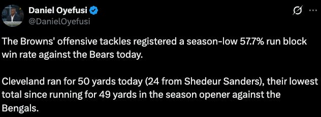 The running game was non-existent despite trying. Quinshon Judkins ran for just 21 yards on 12 carries. They run into dense run boxes, fail to win at the point-of-attack, and cannot layer much of any deception into their run game. It is broken for several years now.