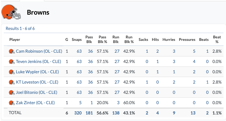 The offensive line continues to be a makeshift group and now the second most variations of starting lineups across the NFL. It felt like they played a decent game in both phases with some good and bad moments — especially bad from the tackles again. Here are the baseline stats.