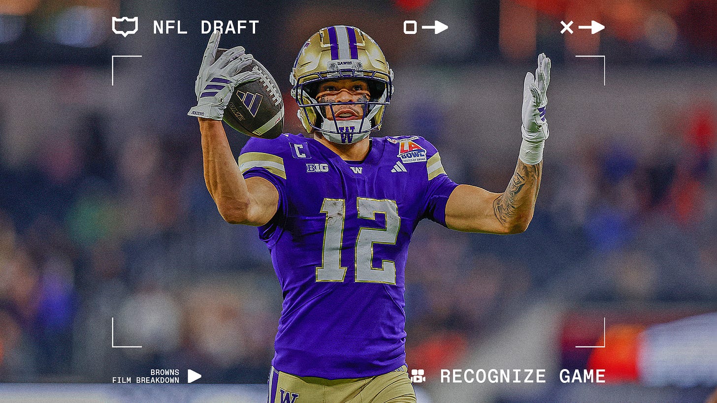 After selecting KC Concepcion in the first round, the Browns have now circled back to double up at wide receiver, grabbing the Washington wideout with their first pick of Day 2. It was a move that raised eyebrows but few complaints in Cleveland — Browns wide receivers combined for just four touchdowns all of last season, making the position a clear priority heading into the draft and they executed it.