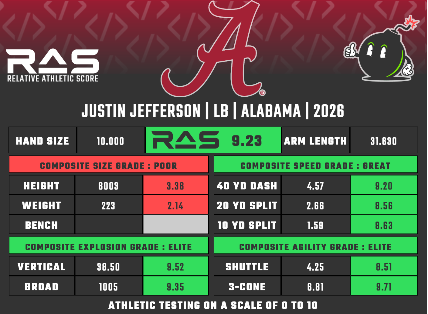 What Cleveland is getting is a speed-first linebacker who can fly sideline to sideline. Jefferson is a true sideline-to-sideline run-and-chase WILL linebacker with high-end speed to close fiercely on playmakers, adequate zone coverage instincts, and smooth hips and movement in space. His athleticism is elite for the position — he scored a 9.23 RAS out of a possible 10.00, ranking 269th out of 3,460 linebackers tracked from 1987 to 2026.