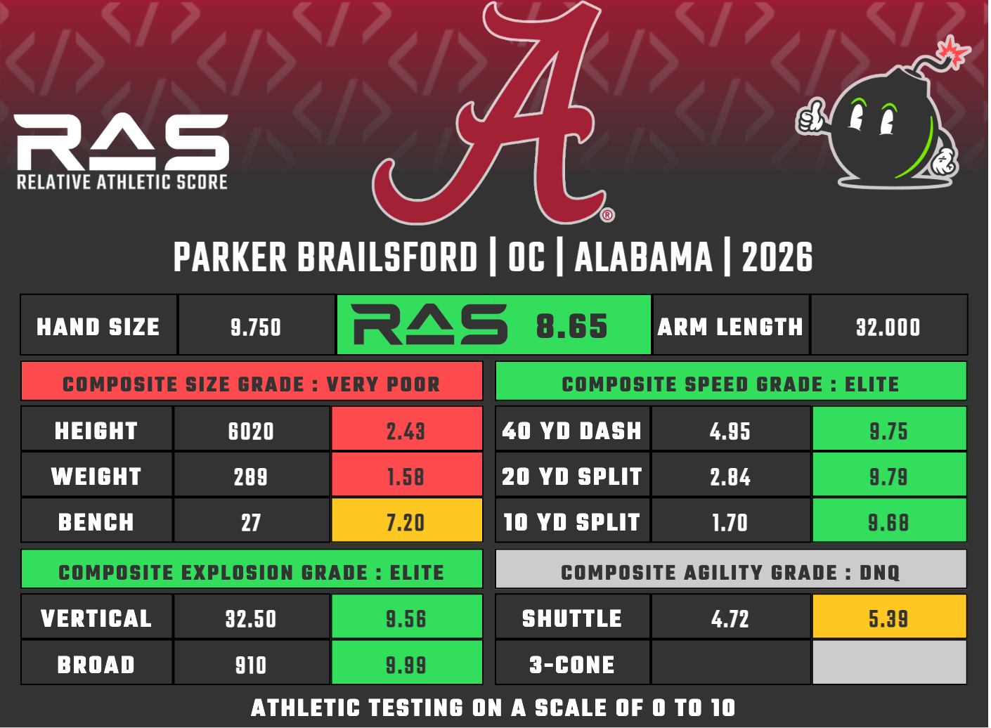 By the time his college career was done, Brailsford had started an impressive 42 career games. He started 40 of those at center and two at right guard, including 14 games as a permanent team captain for Alabama in 2025.