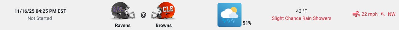 The Ravens come in winners of their last three in a row and aim to get back to .500 while the Browns try to snap a two-game skid that track backs three weeks. Plenty on the line for both sides today as the Browns try to right the ship amidst internal pressure and the Ravens attempt to get back closer to the Steelers atop the division. Should feel like a good “old school” battle in cool weather on the lake.