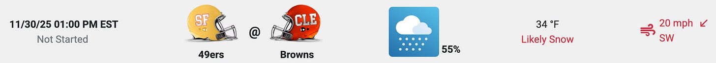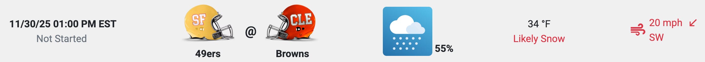 Forecast for Cleveland calls for cold and potentially wet conditions — some sources mention cloudy/damp with wind, which could affect passing and kicking. Snow and Rain before 1 PM - could be a window between 1 - 4 pm of no precipitation, high winds - gusts up to 44 mph, high of 34 - feels like 20 degrees. This one could get nasty for those watching live.