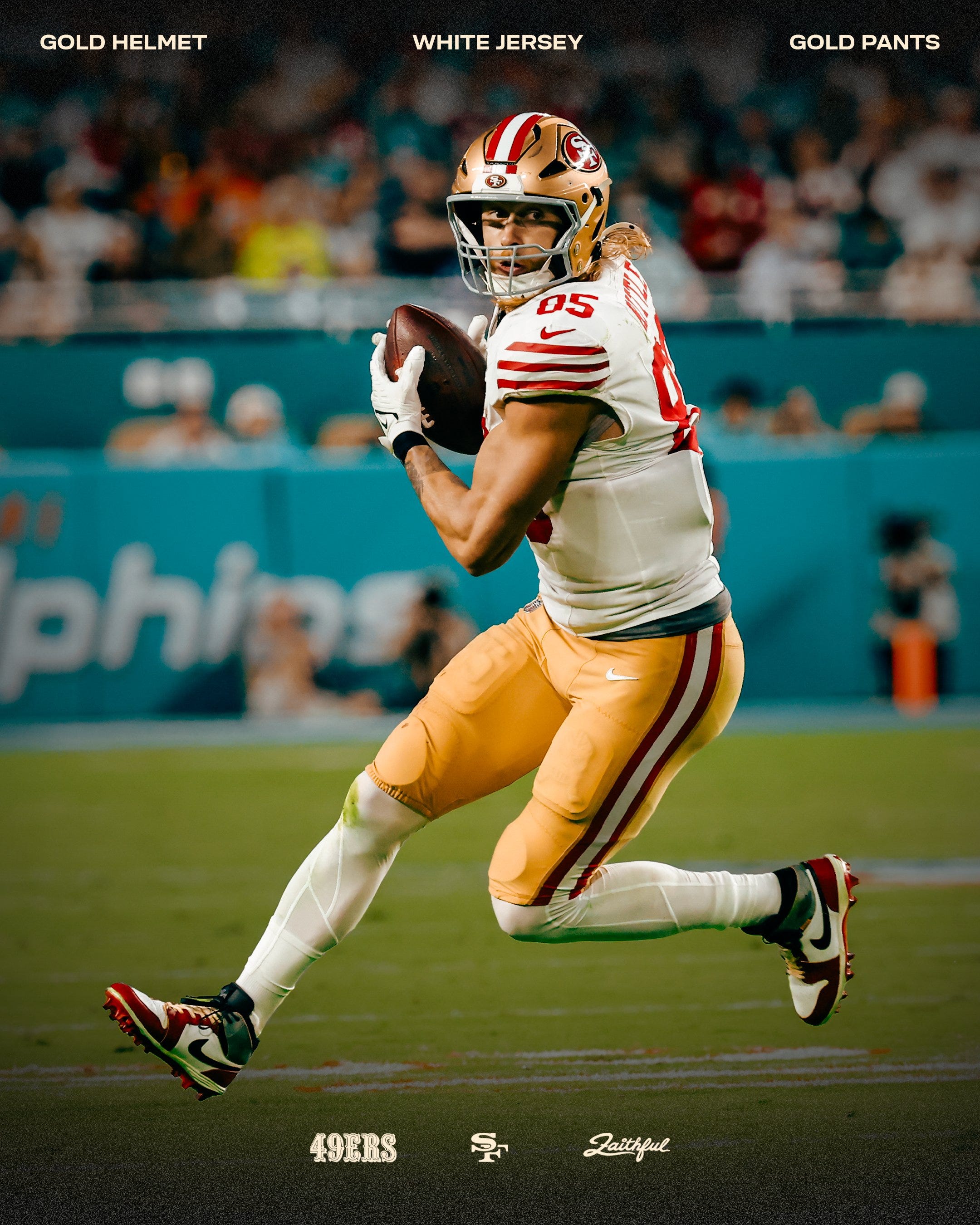The 49ers go with their traditional road uniform and it’s another NFL classic. The gold helmets paired with pants is a perfect look.