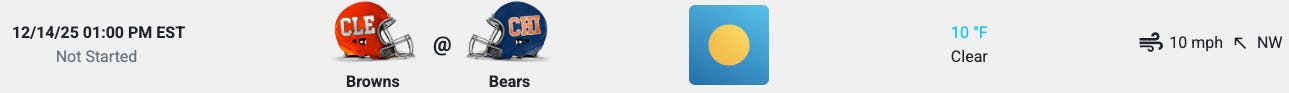 The Bears enter today with a 9-4 record and are trying to setup a big NFC North division-leading contest next week with the Packers once again. They have to win today when you look at their remaining games on the schedule. The pressure is on. The Browns will try to play spoiler in this one but the injury list is long and the desire to be out in this cold weather for a meaningless game will be interesting to track.