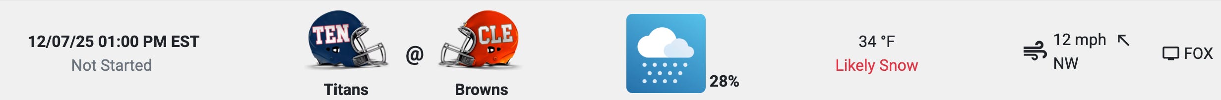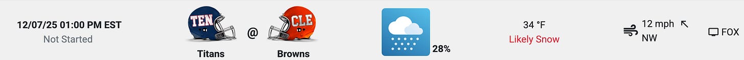 It’s gameday in Cleveland and it’s going to be a cold one, folks. The wind will be whipping and we might see some snow falling. This will have all the throwback vibes of the outdoor football the anti-dome folks love. With those conditions, and the way both the Browns’ and Titans’ offenses have been playing this year, it has a chance to challenge the over/under line even if it was down in the mid 20s.