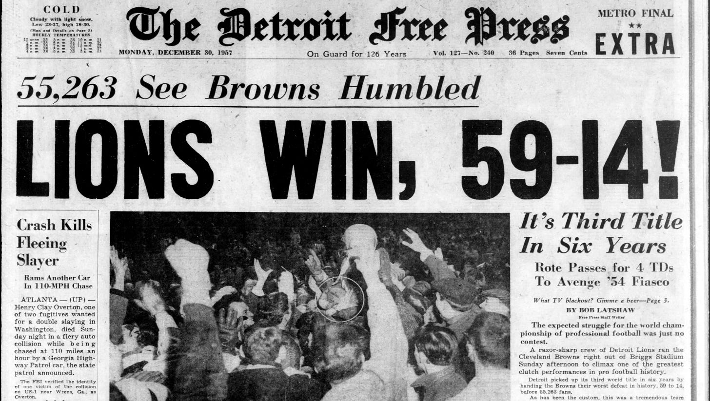 Then the Lions came back and did the same thing to the Browns in 1957 in a 59-14 blowout.