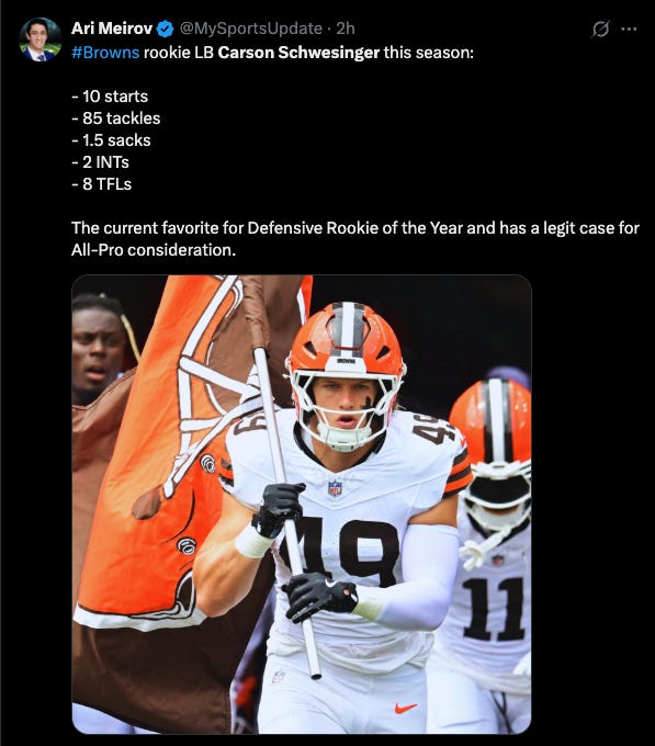 Schwesinger is no longer just a promising rookie; he is now the favorite to win the Defensive Rookie of the Year award. Myles Garrett not only showcases his dominance but may also secure the Defensive Player of the Year title again, despite playing for a team struggling to get wins. While the Browns’ season has not resulted in many victories, it does showcase undeniable greatness. If the voters make the right decision, that talent will be recognized in the offseason awards.