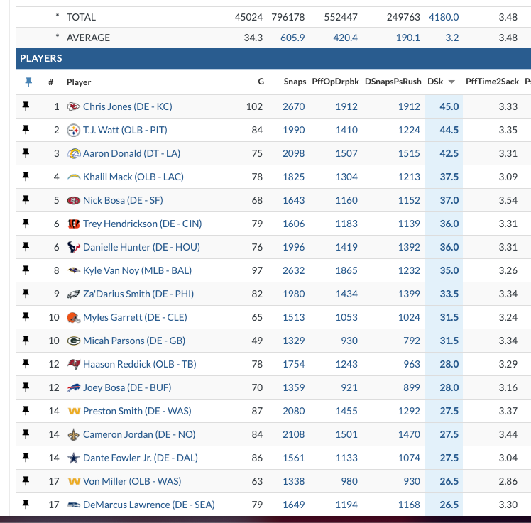 Currently he has 15 sacks through 10 games. That in itself is madness but when you consider he’s doing this despite the Browns only holding a lead for 30% of defensive snaps it gets even crazier. The best pass rush opportunities come when the other team is trailing and in predictable pass situations. The EDGE can turn off the run responsibilities and simply focus on getting after the passer. This is when the best production occurs. The Browns defense has only seen 260 pass attempts, the fewest in the NFL this year across the board and despite that Garrett is currently on pace for 25.5 sacks across 17 games.