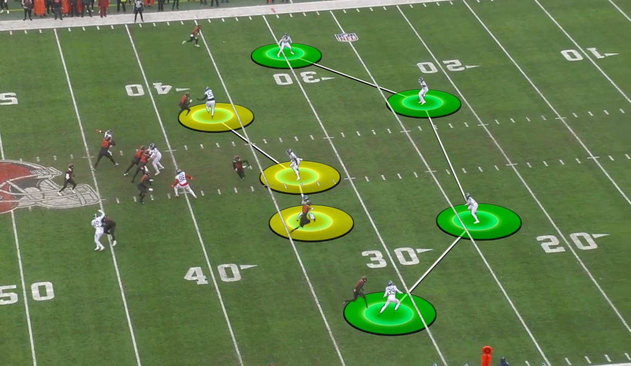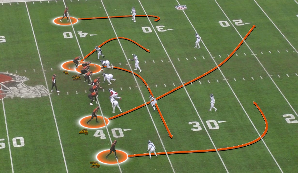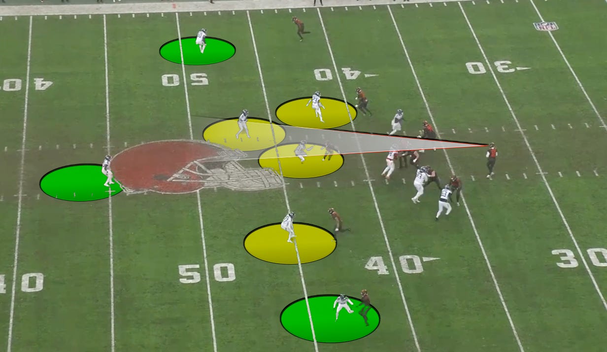 The Browns wanted to get into some empty looks against the Titans defense this past week. You always enjoy getting the coverage indicator that comes with a running back split wide and that is what we get here. The Titans show they will be in zone coverage and that gives Sanders the answers he needs for the concept.