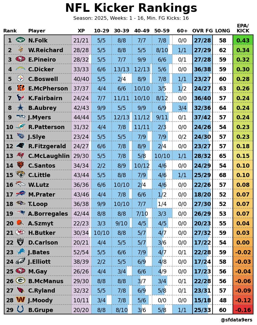 He doesn’t rank higher on this EPA list due to a lack of overall volume (thanks, Browns offense) and fewer long attempts, but he has shown that he is good enough to kick in this league.