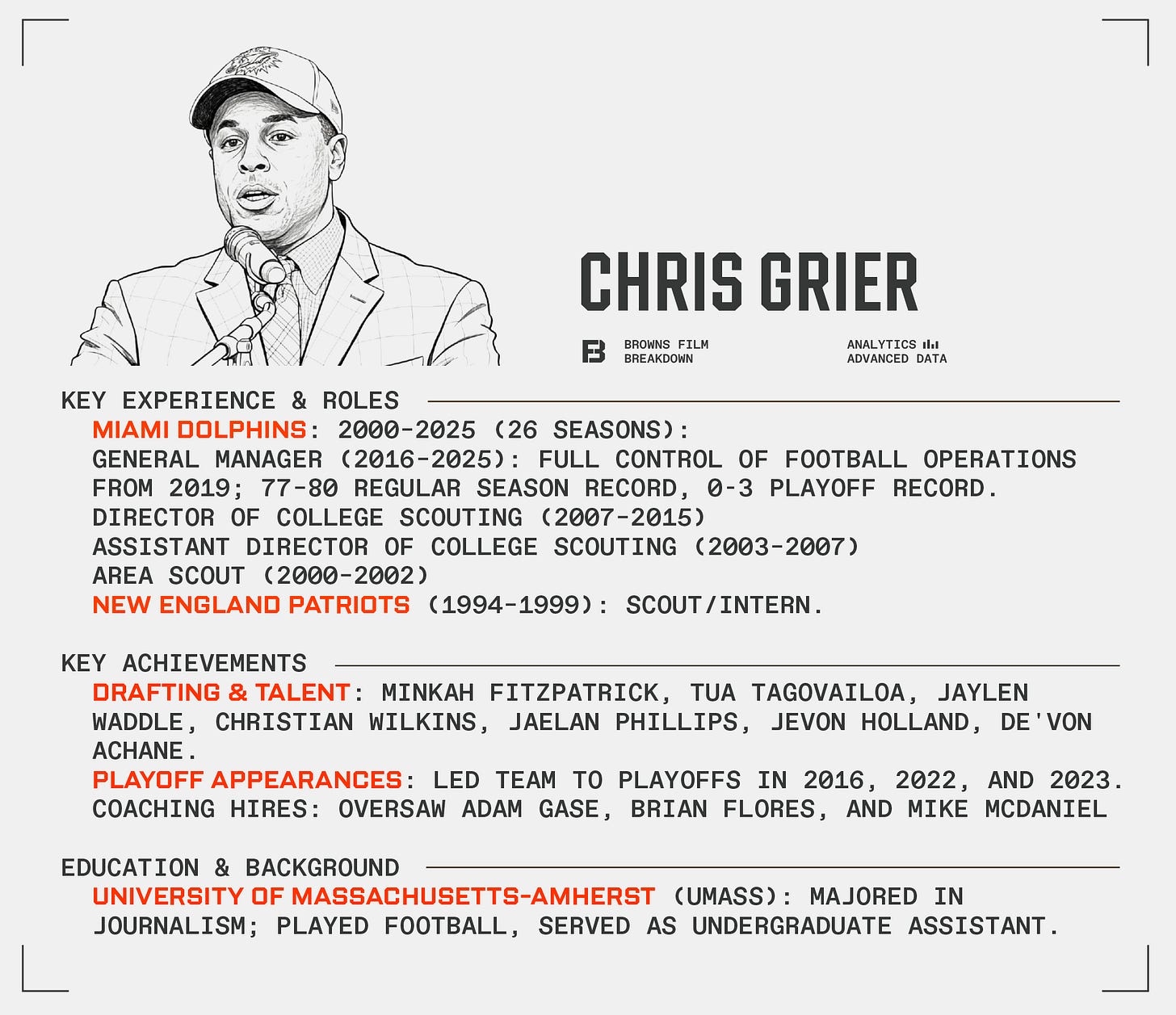 Chris Grier’s resume in Miami is complicated, but informative. He navigated multiple roster resets without ever fully bottoming out, identified and built around a franchise quarterback, and constructed one of the fastest, most scheme-specific offenses in the league. Miami’s roster construction has been intentional—speed, spacing, and defensive versatility. An addition to the front office who builds toward an identity rather than constantly chasing value would be welcome.