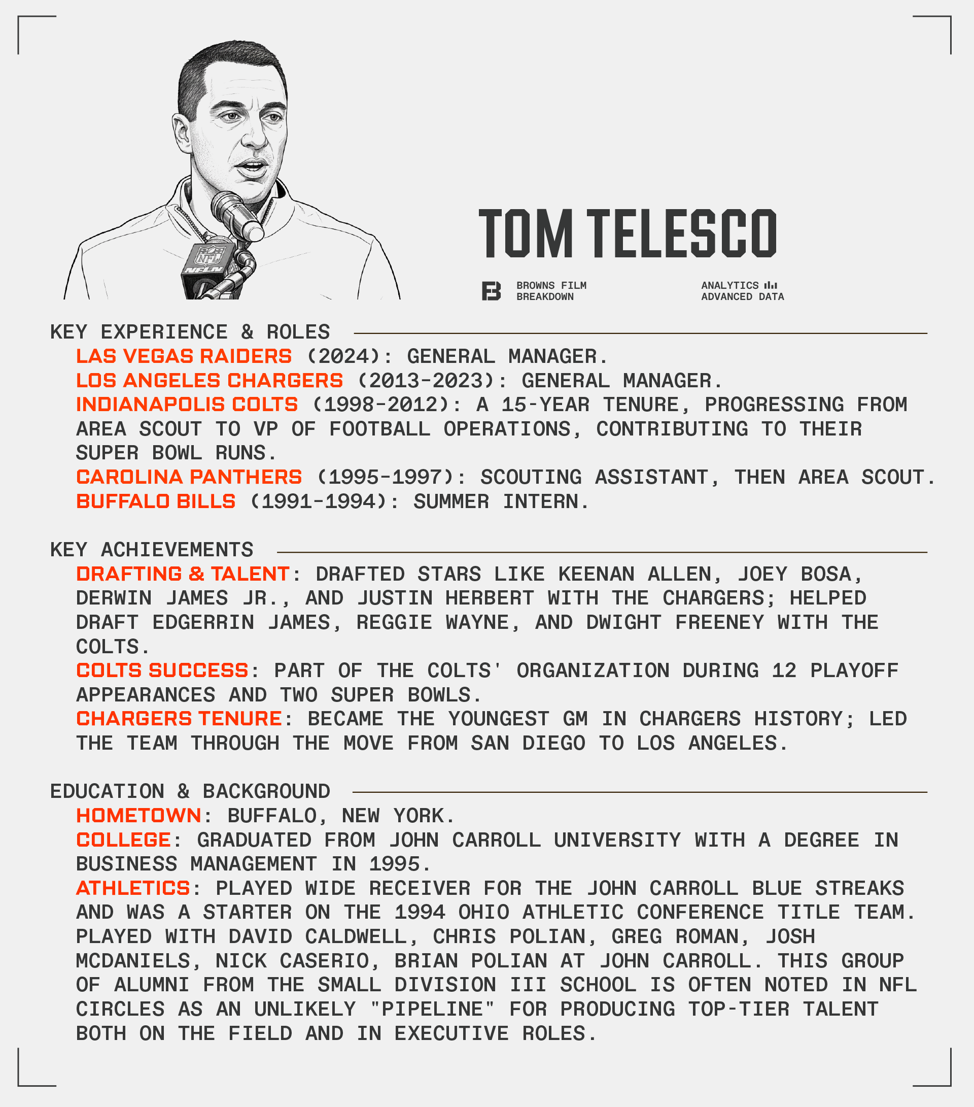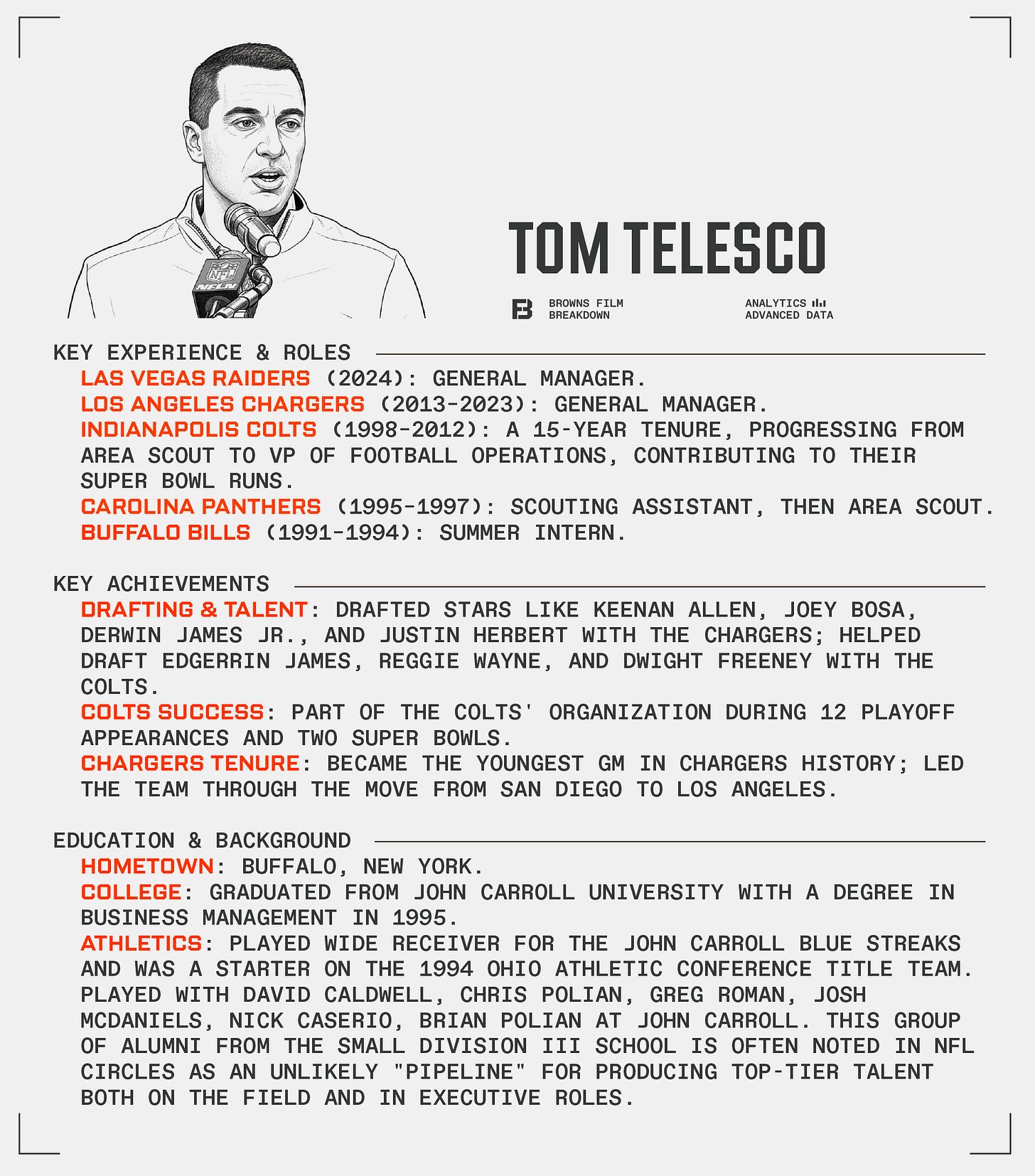 Tom Telesco, meanwhile, is synonymous with elite talent acquisition at premium positions. His Chargers tenure produced a steady stream of blue-chip players—quarterbacks, edge rushers, receivers—often despite uneven on-field results. Telesco’s flaw has never been evaluation. It has been execution around the margins and alignment with the coaching staff that he has missed the mark on. That makes him a fascinating data point for a Browns organization that already has star talent but has struggled with cohesion and optimization.