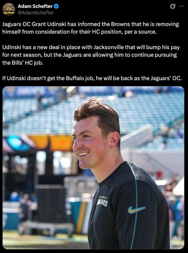 The news bright and early on this Monday is that Jaguars OC Grant Udinski has now removed himself from the consideration for the Browns coach job. As the Browns’ brass flew across the country to meet with Nate Scheelhaase this morning following the Rams tough loss in Seattle, the timing does make you raise an eyebrow.