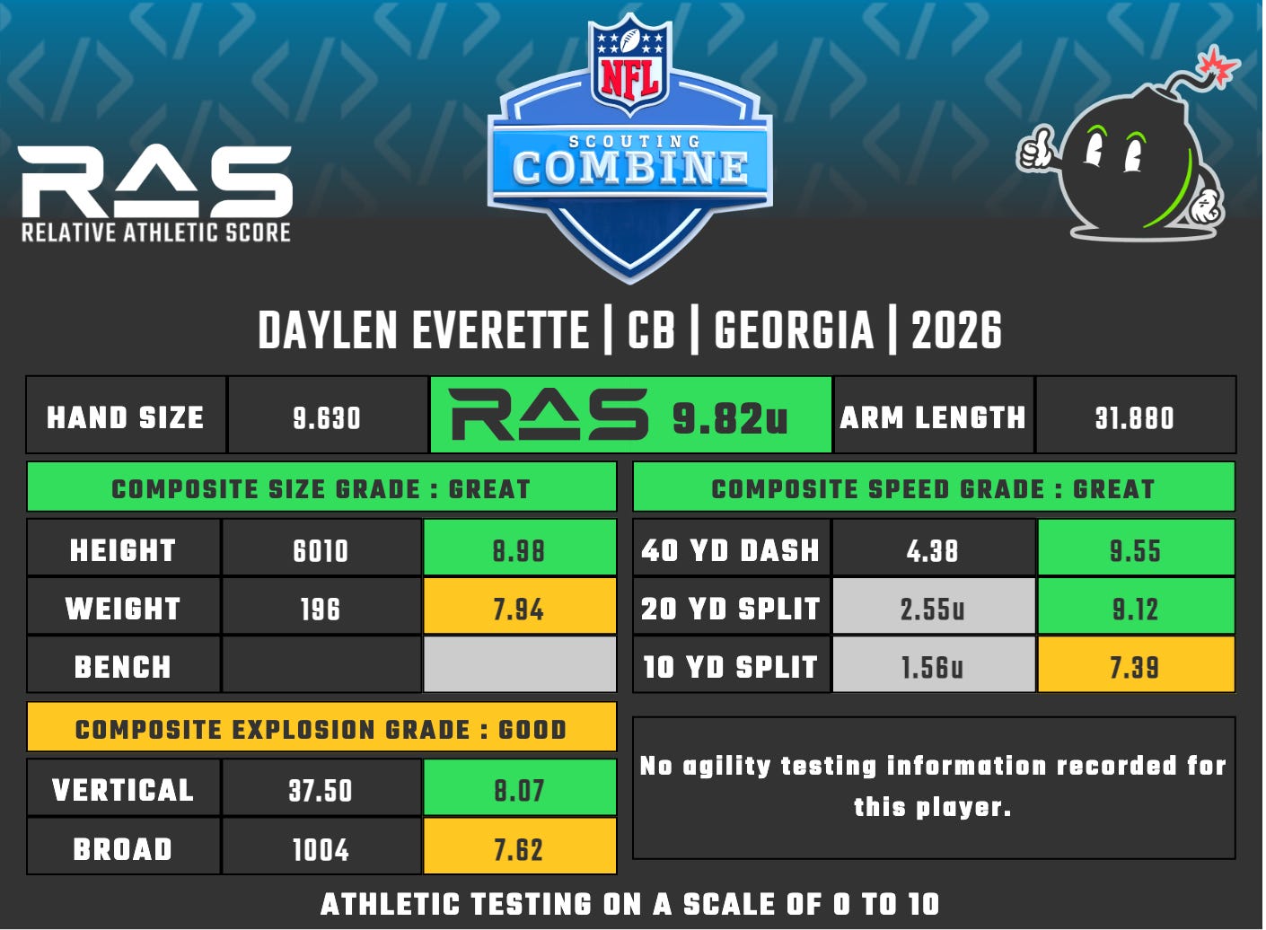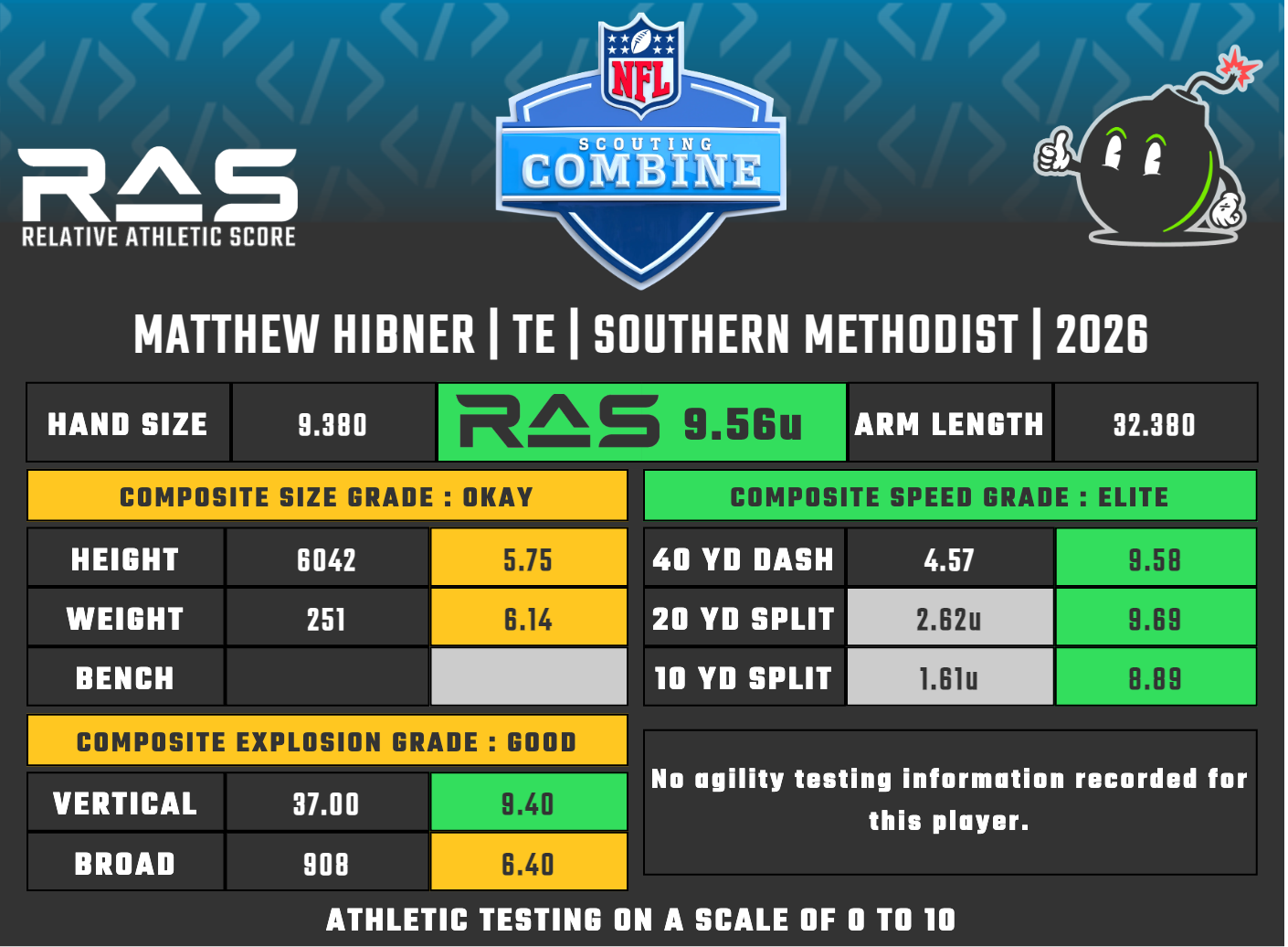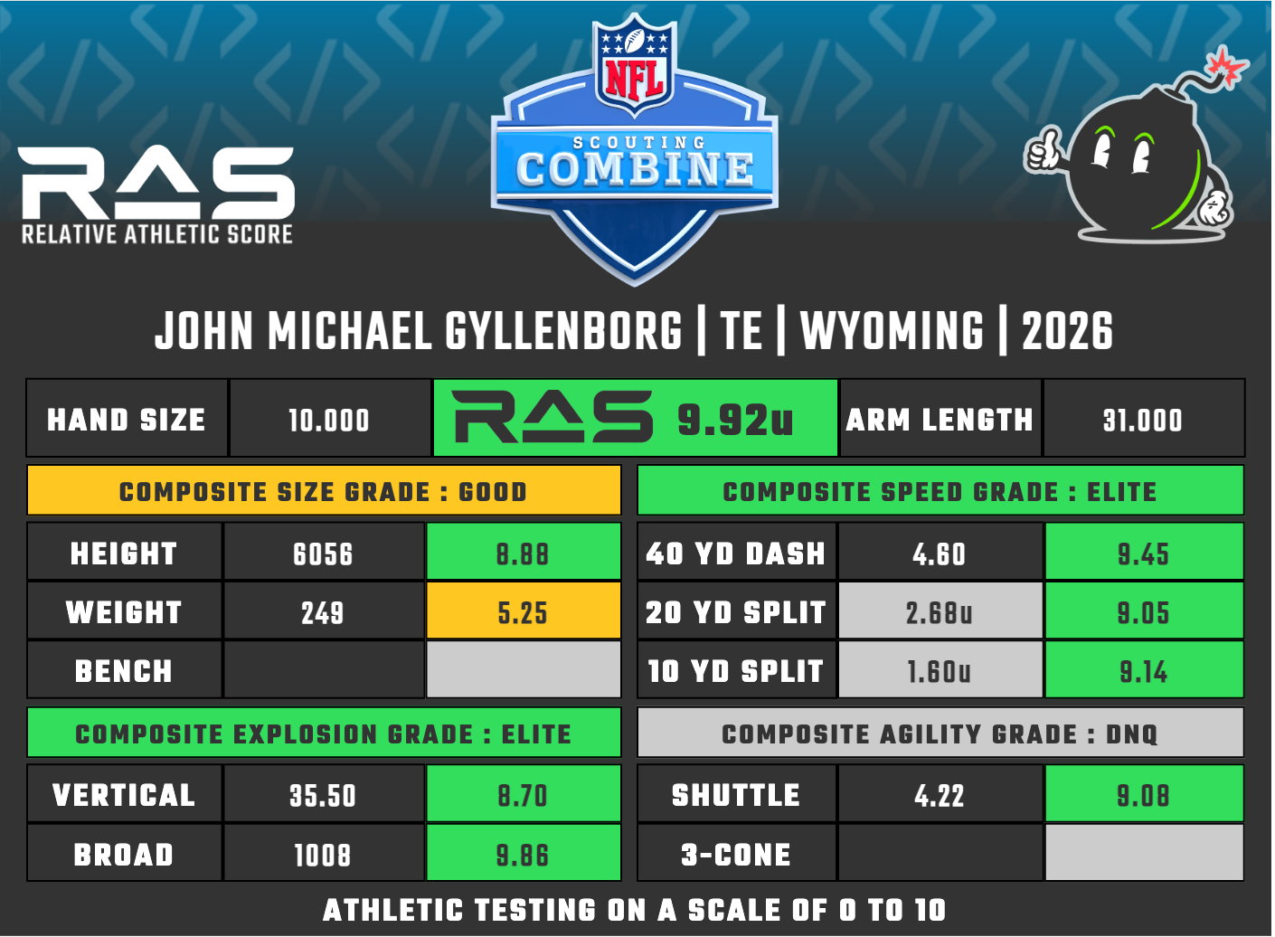 The Michigan turned SMU prodict didn’t have much buzz entering the combine but his film shows a more than capable blocking “Y” with some impressive lateral ability in the passing game. His elite speed grade and more than adequate jumps show there is even more room for growth and production in the right NFL offense.