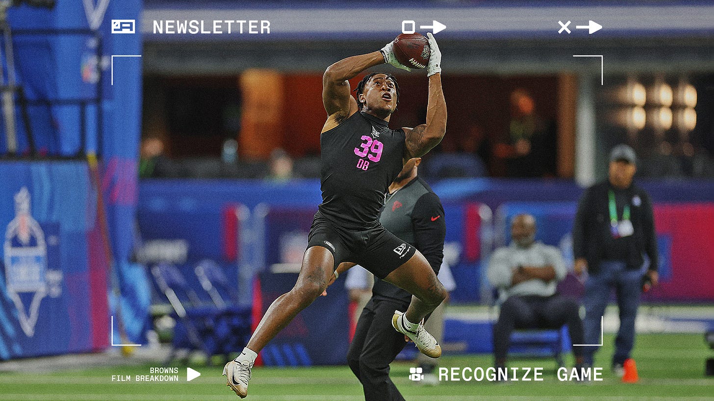 The Browns have their eye on some Day 2 cornerbacks and Everette really helped himself in testing and on-field drills yesteday. Smooth in the agility portions and hauling-in passes away from his frame. His sub-4.4 forty-yard dash was also excellent.