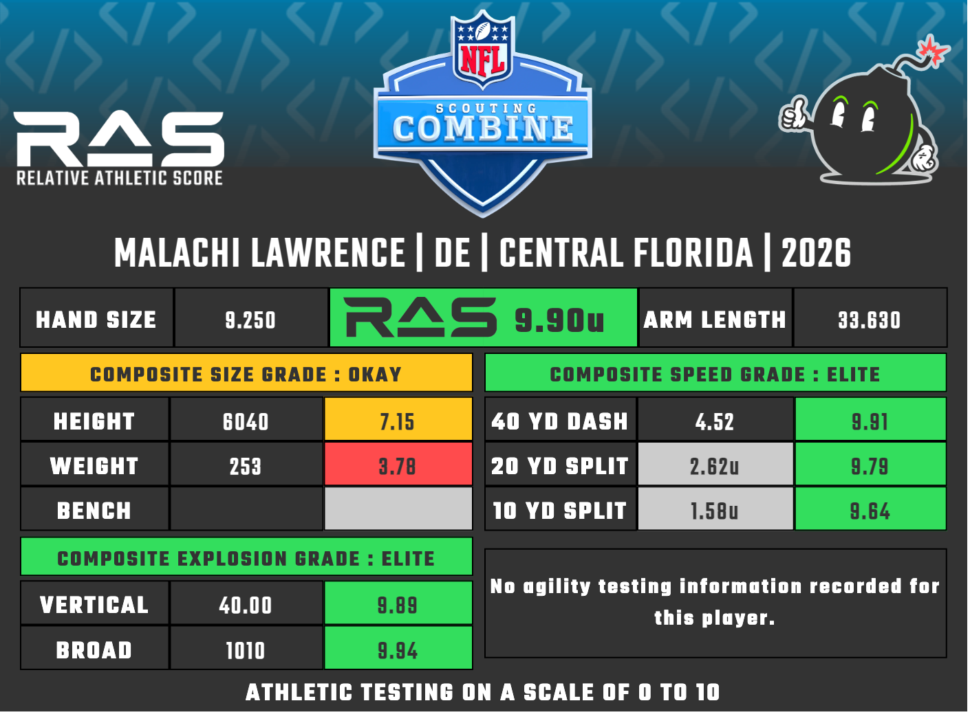 Lawrence was an under-the-radar pass rusher entering his combine testing but he has jumped forward significantly. Still at best a Day 2 player but the testing now matches the production where he had a 22.7% pressure rate. If there was an EDGE to take, this one would be it.