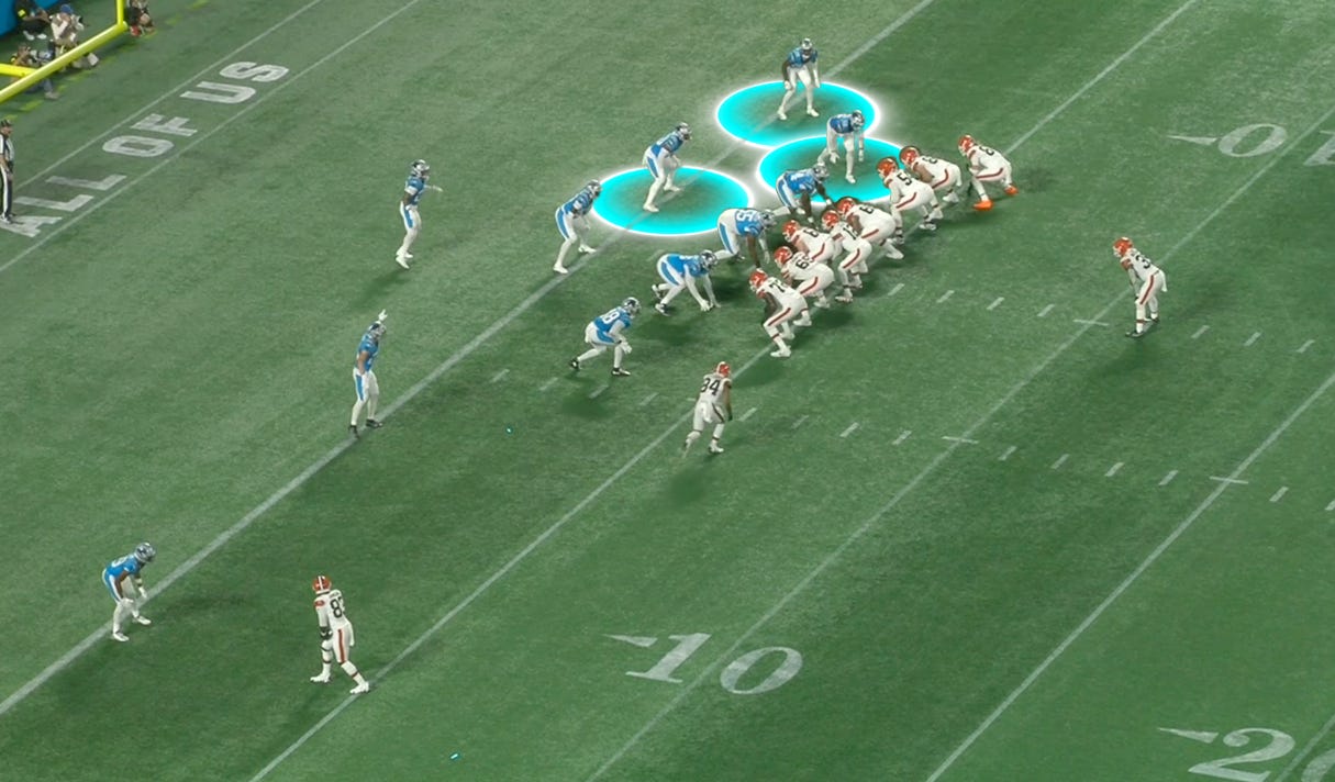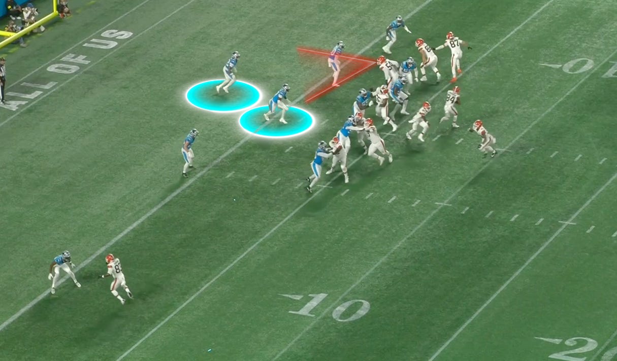 On a late third quarter situation, 4th and short to be precise, the Browns lined up in 12 personnel with a Y-Y wing formation. They set up that heavy side to the boundary to run the sweep into their bigger bodies. In order for the scheme to find success they had to block, or deceive, the playside EDGE, cornerback, and inside linebacker. Those of which are highlighted for you below. You miss on one of them then play is likely to fail.