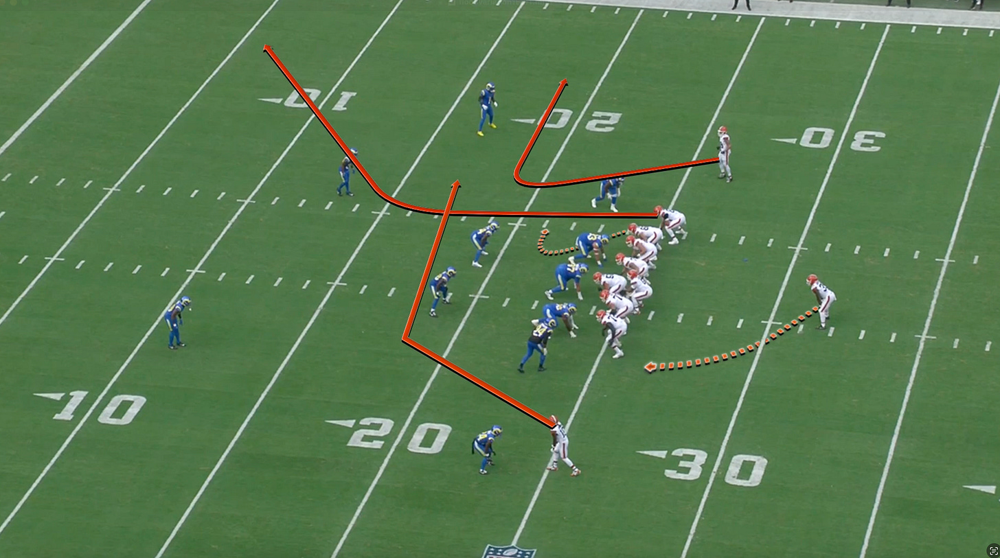 In the coming week or so I want to spend some time with you on the Browns offense staples to help you understand what they are running on Sundays. The first thing Stefanski loves to run is the “flood” variation. Now, this can be called different things across various styles of schematic design but flood is the most common name. Normally it sends three receivers to attack the same side of the field at different depths (deep, intermediate, and short) to "flood" that area with pass options, forcing defenders to overcommit or leave space.