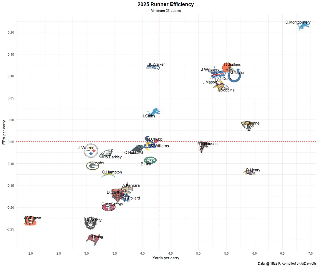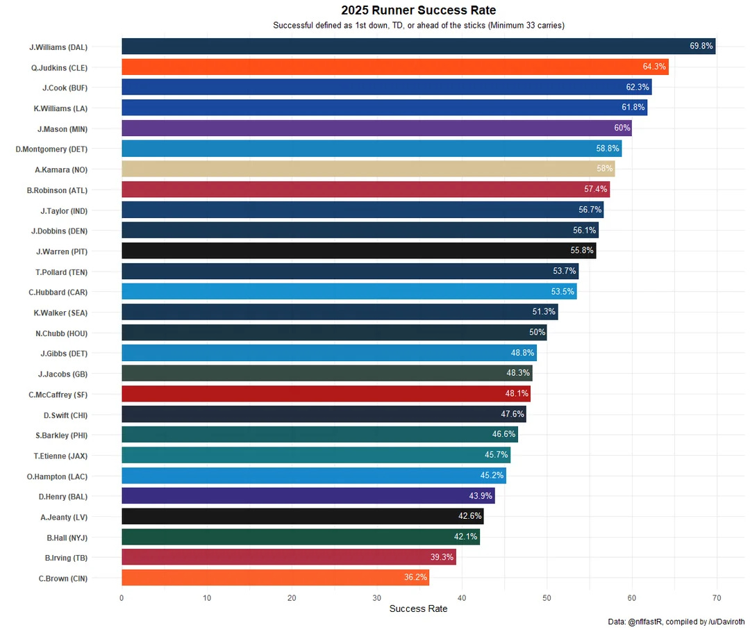 The data will tell you that through just two weeks of action he is among the better performers across the NFL with a success rate that challenges James Cook in Buffalo and other premier talent at the position. Huge thank to BFB Founding Member “Daviroth” for providing the visual here.