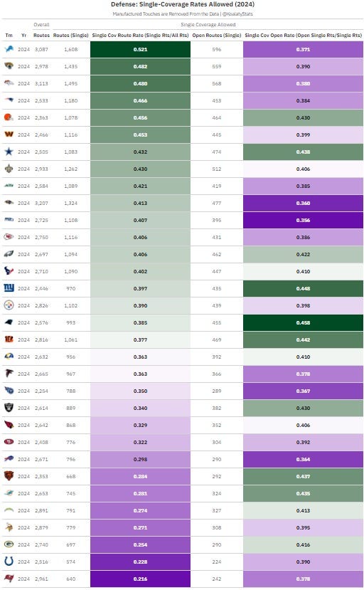 I caught this breakdown last night of 2024’s coverage data and how many single coverage routes teams use in their scheme and then how many of those routes get deemed “open” when the single coverage techniques are used. Now, obviously the man coverage dense teams will have more of the usages — as the top teams in man coverage percentage are at the top here — but the interesting data point is the “open” volume.